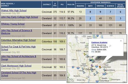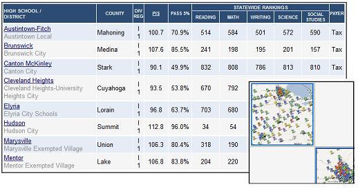 This web site specializes in bar charts, but many appreciate viewing the data other ways. Below is an academic map view of Ohio schools.
